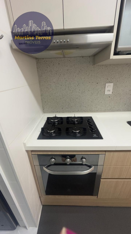 Piso laminado na sala e quarto, armários na sala, quarto, cozinha, área de serviço e gabinetes na cozinha, banheiro e área de serviço.